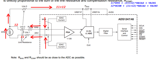 In the accordance with the Three-Wire RTD Application with Hardware Compensation of SBAA180 of ADS1147(see below), the red line was marked is the direction of current, and use the RBIAS to produce external reference voltage.