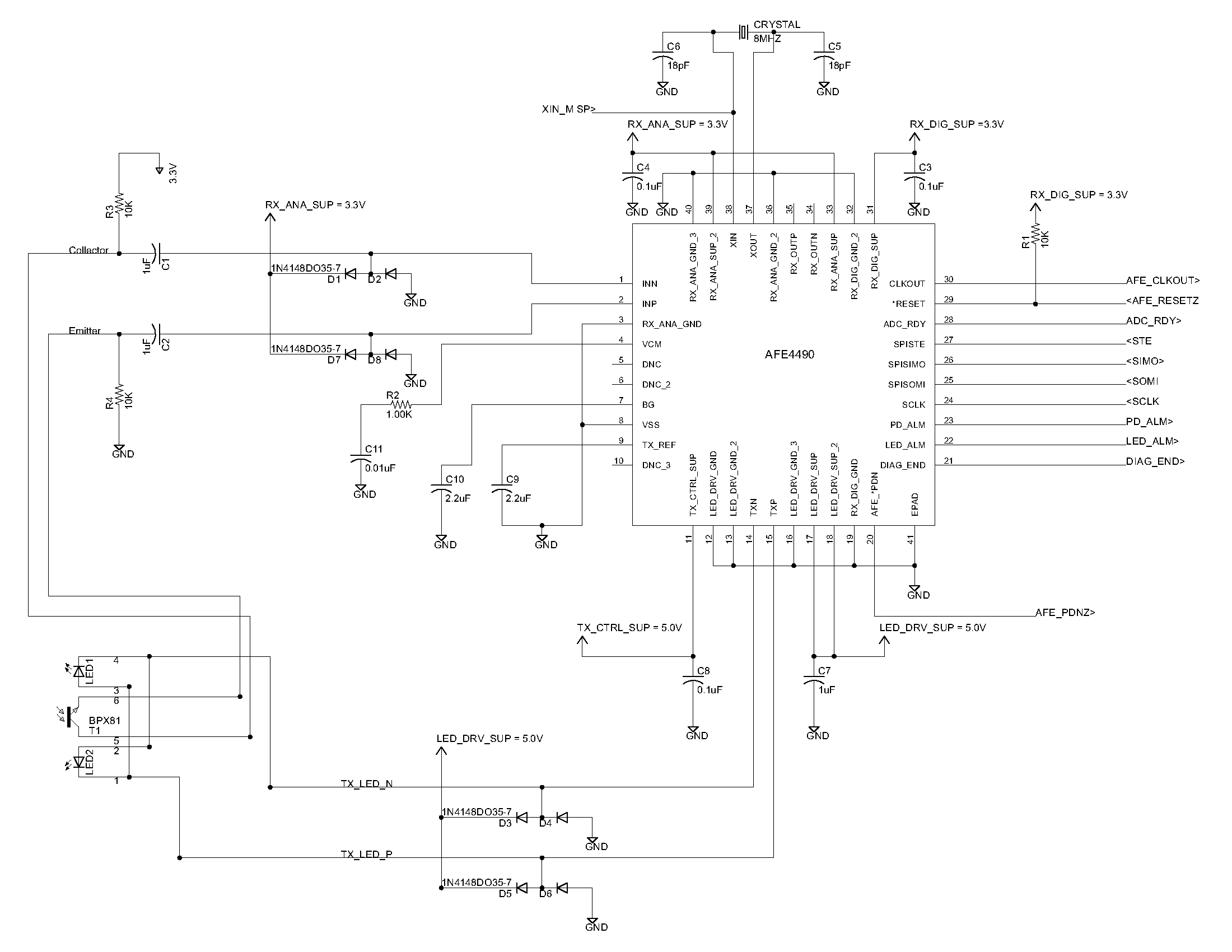 I have created a prototype of my circuit around the AFE4490. All reference voltages and the clock are returning expected values, which means that the AFE is working properly. I have NOT interfaced to a microcontroller just yet. Should my LEDs be lighting up when interfaced to the AFE in its default state, or does that require the MCU to be interfaced and communicating with the AFE first?