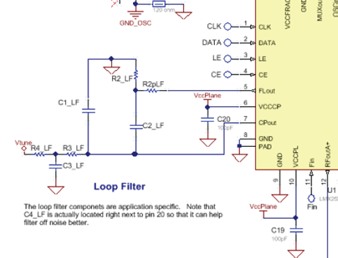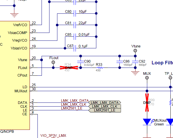 The Ref schematic for the ADC12J4000EVM has the Vtune pin shorted to the CPout for the LMX2581. However, the data sheet shows it a different way. The first two images are from data sheet of the LMX2581 and the last is from the Reference design.