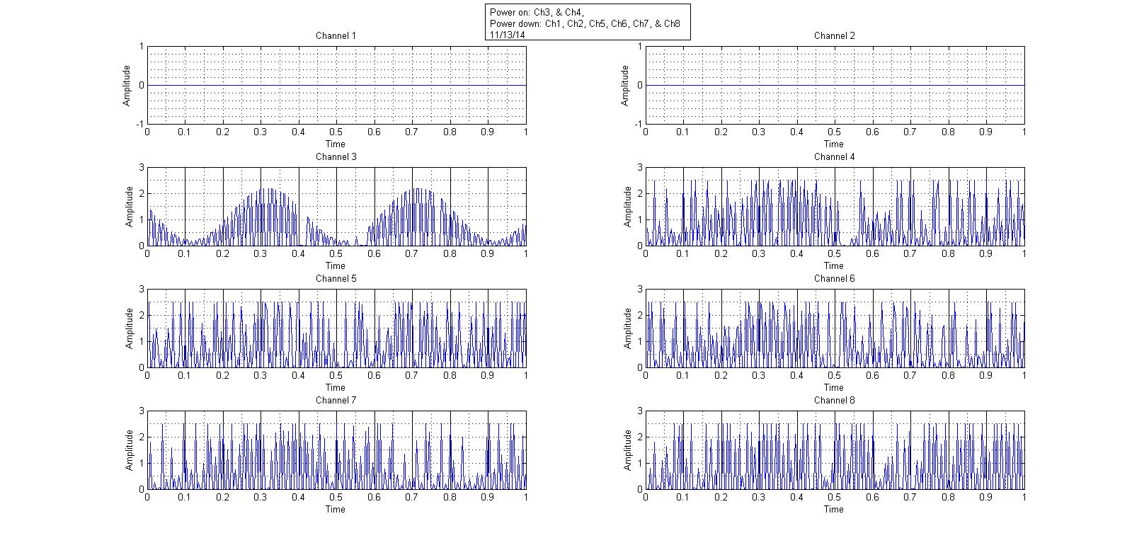 1. I try to read data from multiple channels . I apply 1V sin waves to channel 1 and channel 2 powering down all the other channels by S1. I receive the wrong output as in Figure (2). I expect channels 3 to 8 to be zero but they are not. In addition channel 2 is very noisy that I cannot apply signals with smaller amplitude.