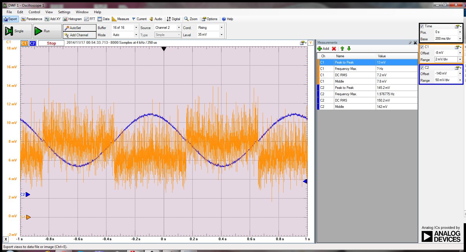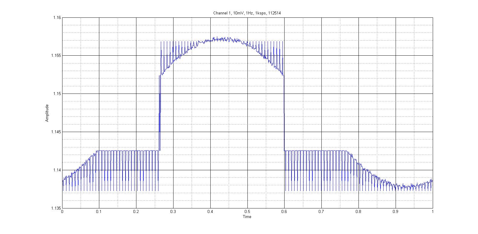 2. My second problem is with small amplitudes and lower frequencies. I need this device to detect signal about 1mVp-p and frequency of 1Hz. As I decrease amplitude and frequency I come up with the problem in Figure (4) and Figure (5). Inputs are 100mV, 1Hz and 10mV, 1Hz respectively.