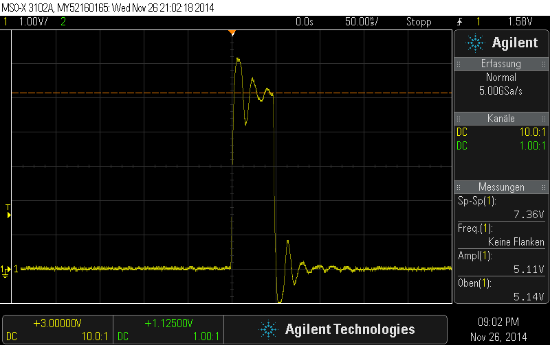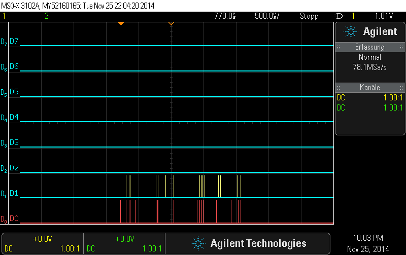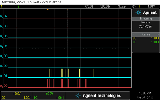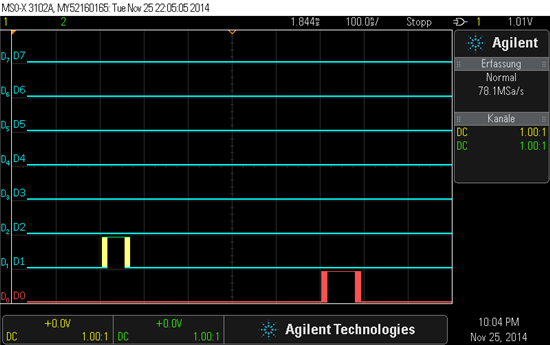 I connected the digital switch input to a pull up and to GND with a wire. If I put the wire in (output should switch on) I get this on LATCH and CLR pins (the port bounces):