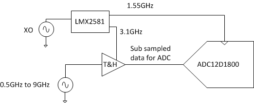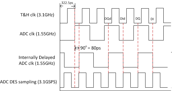 As per my application I have an 12 bit ADC(ADC12D1800) for the RF signal digitalization in the range of 0.5GHz to 9GHz , In order to down convert this in the front end of ADC I have track & hold amplifier. Both T/HA & ADC requires the sampling clock , I planned to provide 3.1GHz sampling clock to THA & 1.55GHz sampling clock to ADC(ADC will be operated in the DES mode). As per the above configuration I want 90 shift between 3.1GHz sampling clock & 1.55GHz clock.I planned to use LMX2581 as a clocking source for ADC as well as TH/A which has two o/p channels. As per my application requirement I want 90degree phase shift between 3.1GHz clock as well as 1.55GHz clock for this I planned to use delay block which is available inside the ADC. I have one query on this ADC12D1800 what is the maximum possible delay we can introduce on the sampling clock on DES mode of operation. Whether the above circuit will work ?