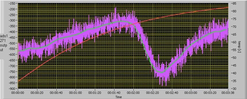 I am using an ads1271 and I noticed a nonlinear temperature response. When I connect the two differential input to the Vref and change the temperature from 30-80 deg.