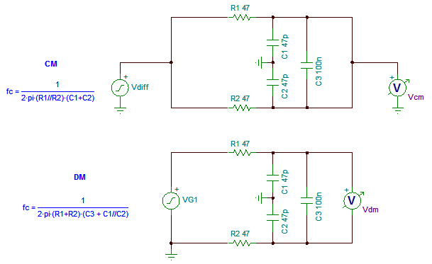 The filter shown in Figure 70 provides both common-mode and differential signal filtering. The cutoff frequencies are given by the equivalent RC filters for each mode. Here is the standard form of this filter with the equations for the cutoff frequencies: