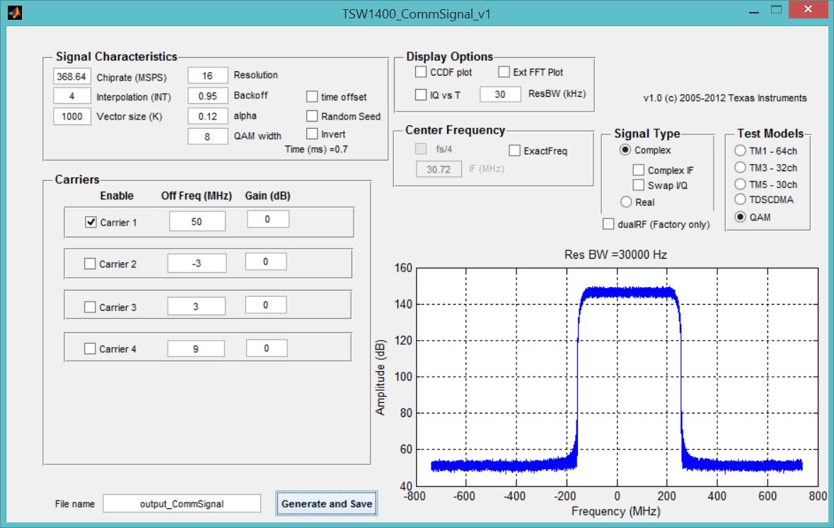 I am trying to use the TSW1400 Waveform generation software to generate a simple QAM64 pattern on the TWS38J84EVM board. The Bandwidth of the QAM outputs that in generated stretched to the full bandwidth of the DAC. Which is way huge in this case. I need to run a smaller bandwidth pattern but a high sample rate, like a QAM64 in 10MHz of bandwidth, How can I get the software to do this? I have App note SLWU082 but it has no examples on QAM Shot of my TSW1400 software generator screen attached show how the qam got stretched to 400MHz of bandwidth.