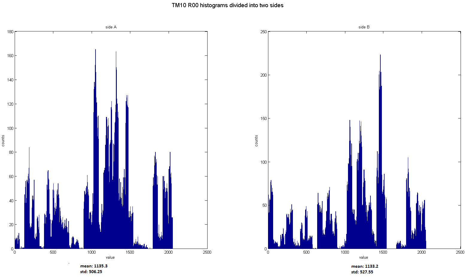 I wanted to test the chips in TM01, TM10 and TM11 modes (each TM in all ranges - from 3 to 12 pC). I have gathered many data in each mode (eg. 65536) and created histogram of the collected data. What surprised me is that the standard deviation is relatively high. Below is an example of the TM10 test. Please look closely at the R01 (R00 is similar) histogram. Besides values around the mean value there are some peaks from 0 to 2000. RANGE[10] (12 pC) looks completely different and the standard deviation is acceptable.