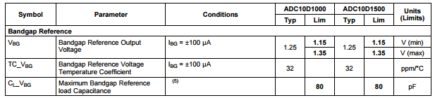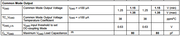 In the ADC10D1000 datasheet (page 19) the Vcmo Lim tolerances are stated as 1.15V and 1.35V, Vcmo nominal 1.25V. Temperature coefficient of 38ppm/C is also given