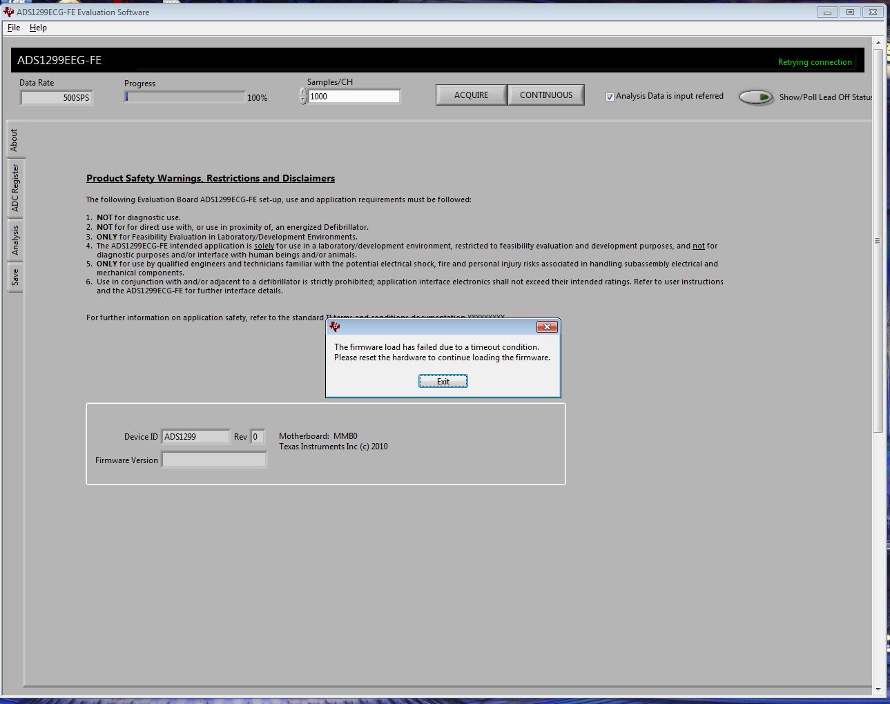 I received the LATEST BOARD THREE DAYS mmb BOM e . I get error firmware not loaded. Sometimes I get a DSP failure? I tried using NI loader and install the bin folder in the fw folder. Still the software times out. I looked at my control panel and I did not see any yellow flags. I am using Windows 7 (64 bit)