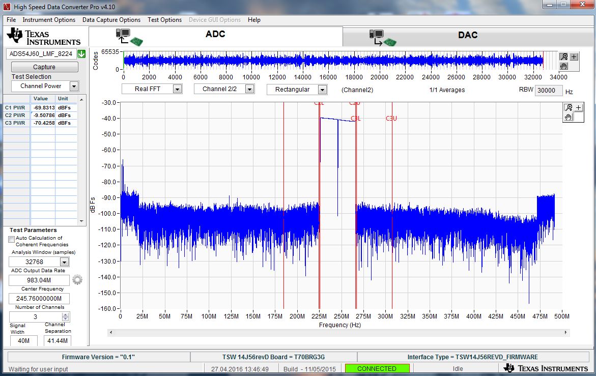 I’m using the TSW54J60 (Rev B) for the feedback of a large bandwidth DPD system(Tx=TSW38J84,FPGA=VC707). I’m using discrete multitone signals with up to 200MHz bandwidth. I’m locating the IF at fs/4 (fs=8x122.88=983.04MHz) to get the maximum bandwidth out of the device (bandwidth of approx. 4x122.88= 491.52MHz).