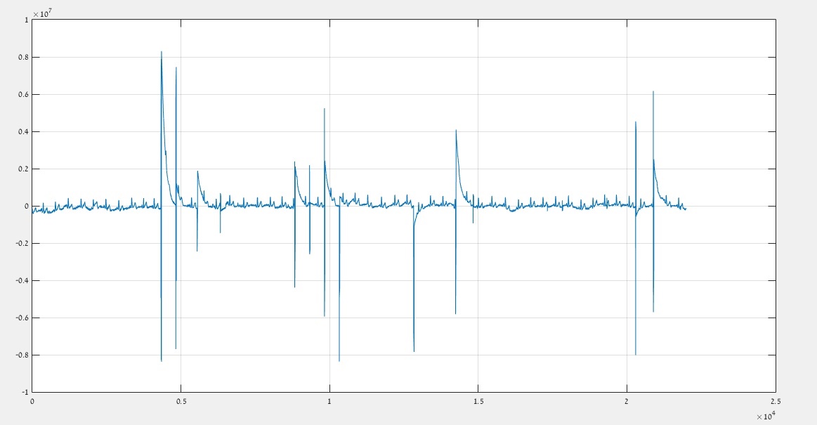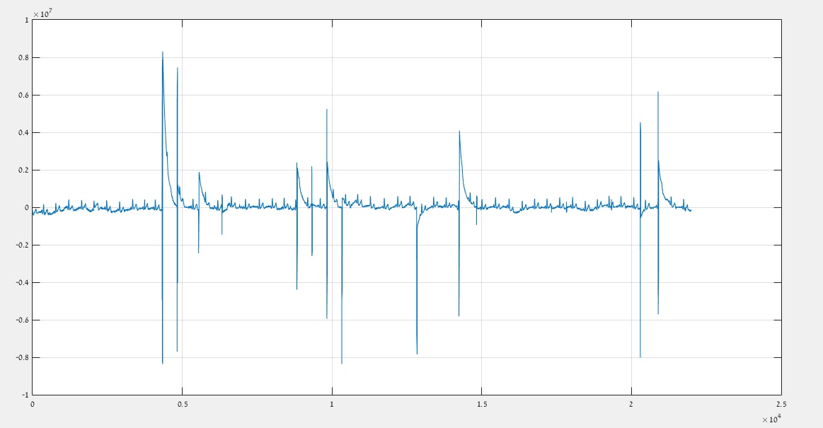 This is a record of the data coming from the sensor, after being filtered by 40 Hz low pass filter (ECG_ProcessCurrSample() - TI Function).