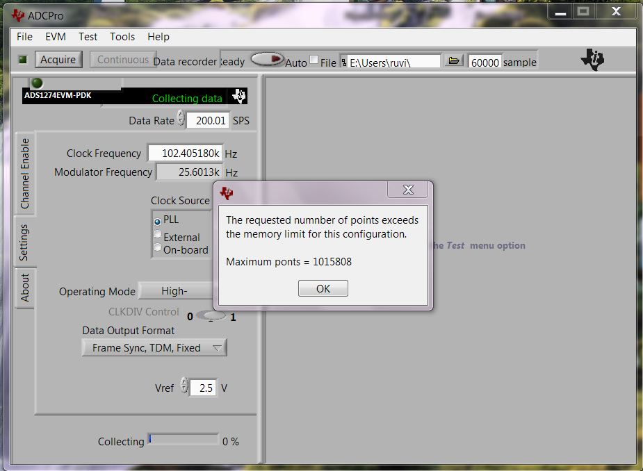 So even in case I put 60000 into the ADCPro Sample number window and initiate the sampling process, pop-ups error window that says
