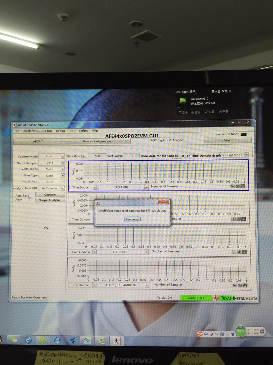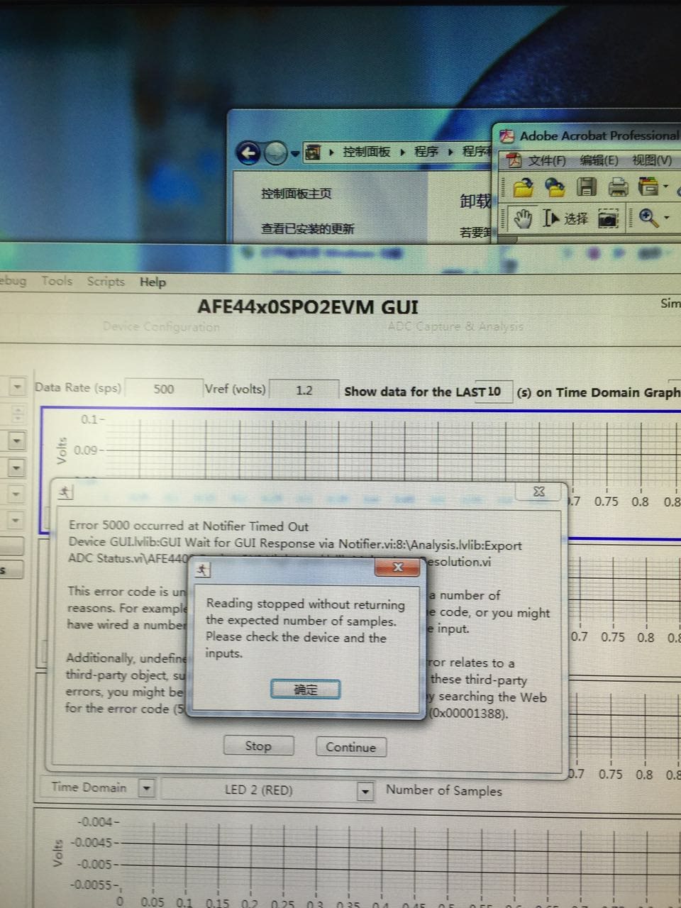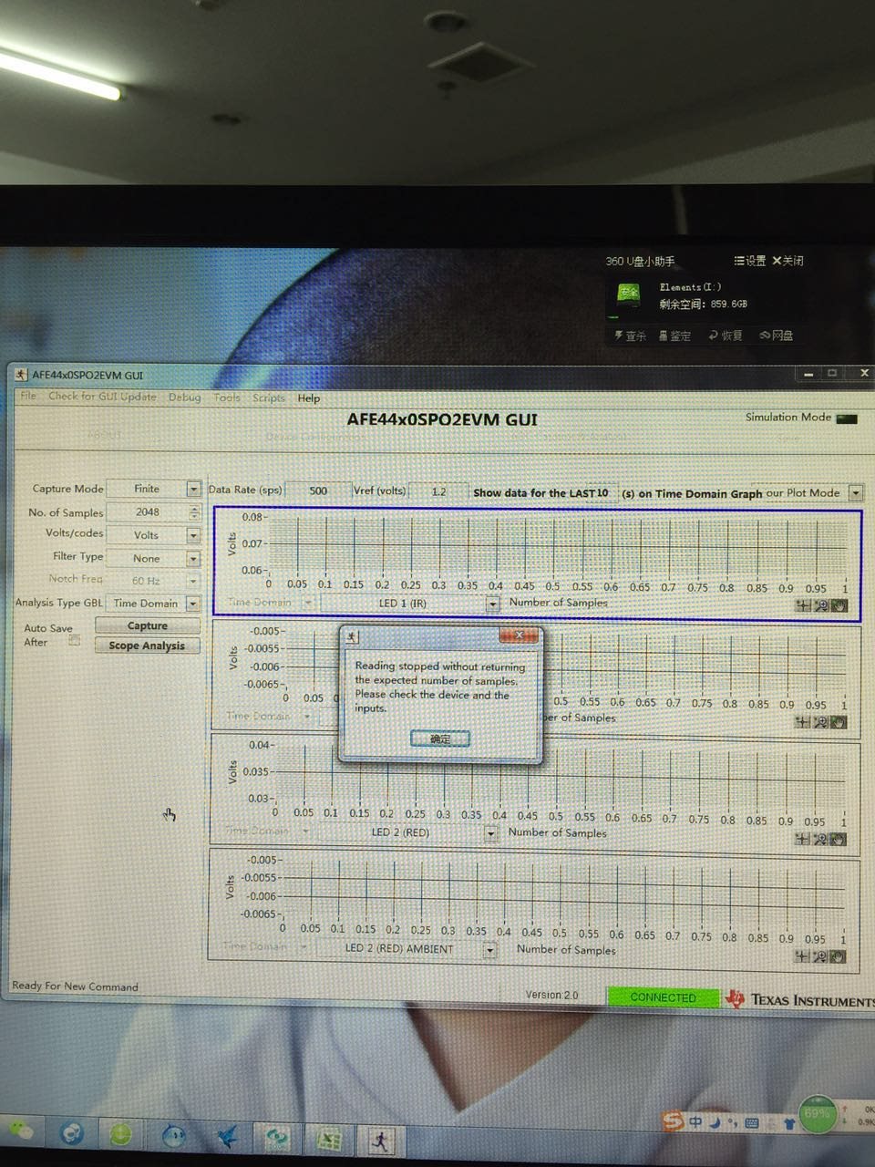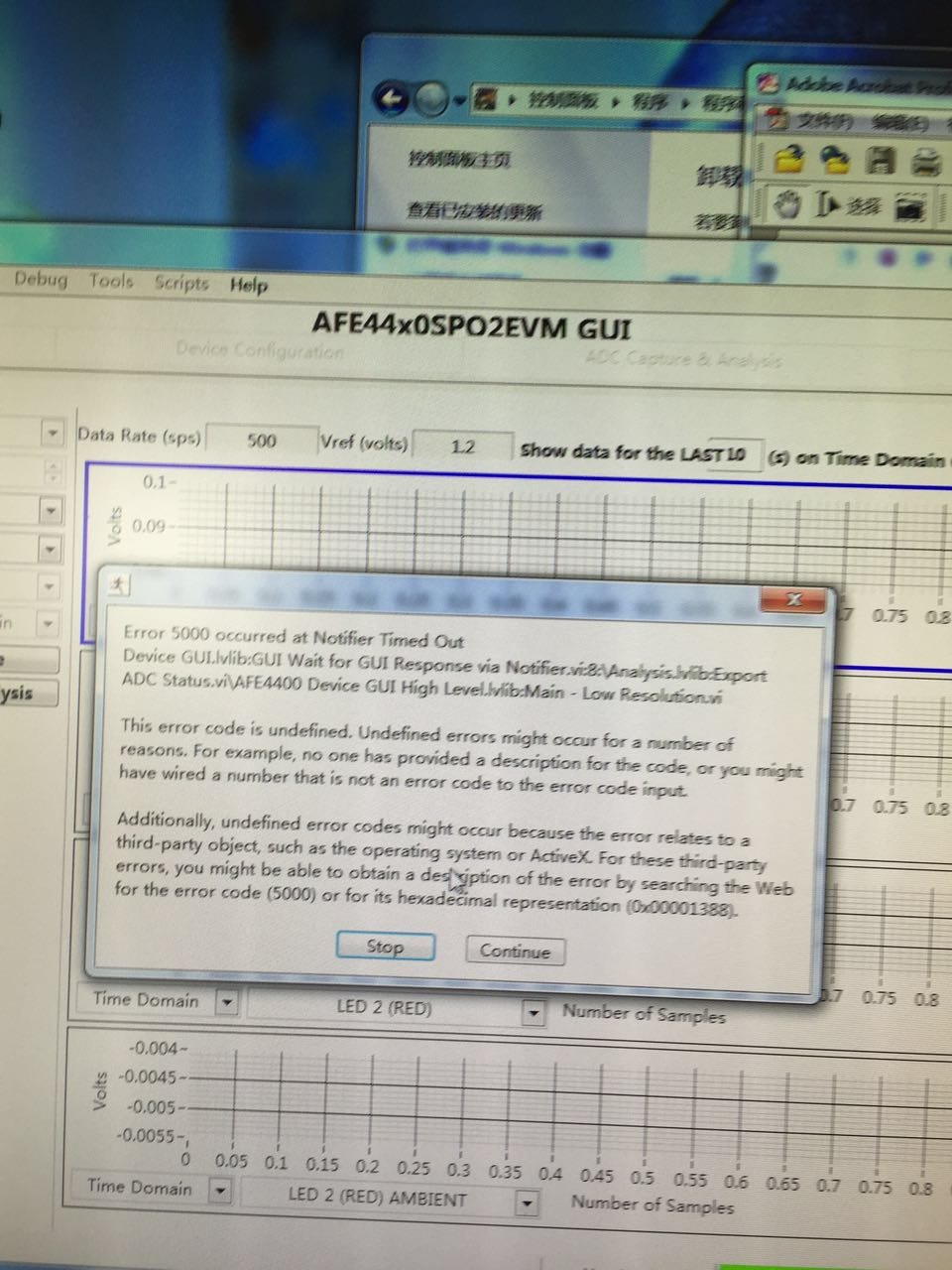 I just bought a AFE4490SPO2EVM a few days ago. I followed page 36 of AFE44x0SPO2EVM User's Guide to capture a sample data like figure 44.But the GUI had nothing to display.Just showed some dialogs below:If AFE4490SPO2EVM is broken?