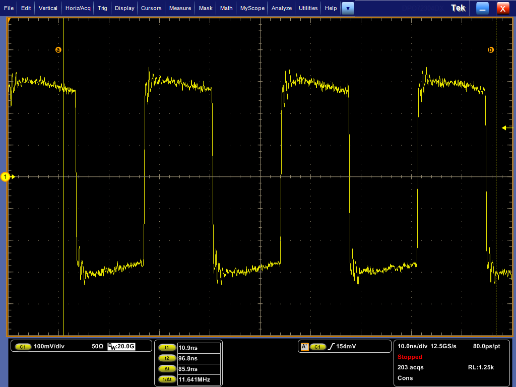 I also tried to generate square wave, whose period is 27ns and duty cycle is 50%. But the generated square wave still doesn't have a flat top/bottom.