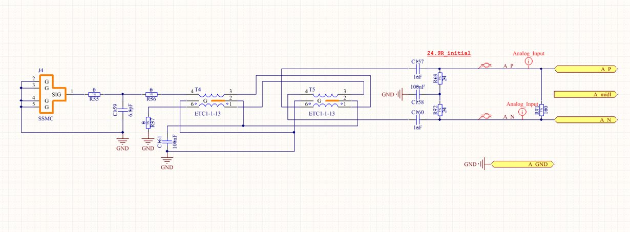 In my board i use dual balun ETC1-1-13 identical matching circuit as EVM board for ADS5402 EVM.