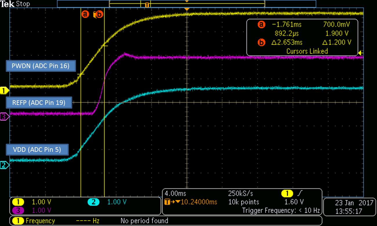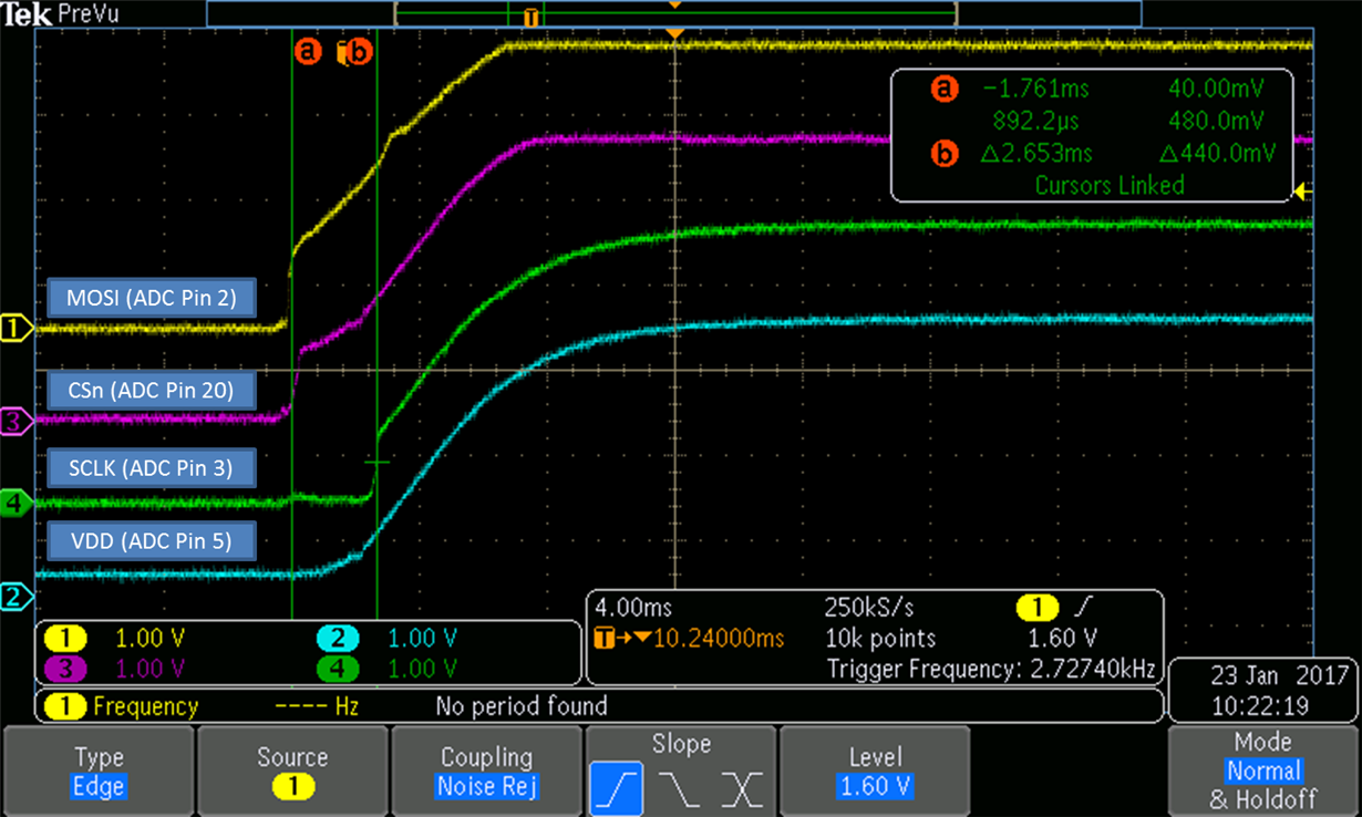 We’ve been using the TLV2548IDW ADC in our product (several devices per unit) for some time and have experienced a very rare event where after power-up, one of the devices (the same physical device each time) either doesn’t respond to SPI transactions, or is driving SPI MISO with all-ones data (because we have a pull-up on MISO it’s hard to tell which of these is happening). Meanwhile, the other TLV2548 devices in the system are functioning consistently good. All devices get CFG register initialized to the same value (0x0004) which is basically the register default with only the EOC/INTn output pin mode set to EOC mode. With the problem present, if we can do a soft reset of our processor, the ADC in question starts to function and the problem goes away. The problem only happens at power-up and has happened on a few different units. Also, when running in this failed state (SDO all-ones output or tristate) for ~10 minutes, our processor got hung in a routine that polls the EOC pin for conversion completion. This seems to indicate that the device suddenly got out of the bad state and asserted INTn (instead of EOC). Are there any conditions that can cause the device to get into this bad state upon power-up?