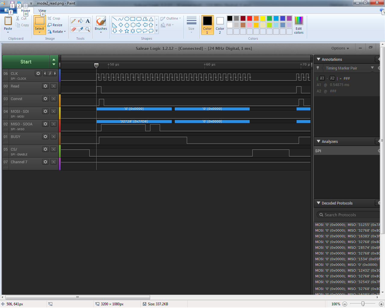I am attaching here the file from the logic analyzer, I have doubts about my CONVST and RD signals. I set them up such that RD always come half-clock earlier than CONVST.