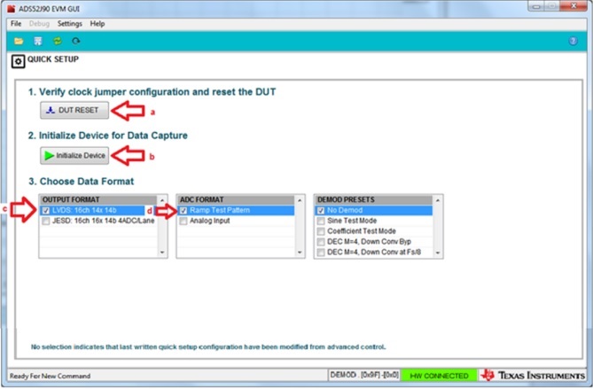 I am currently attempting an evaluation of the ADS52J90 using an ADS52J90EVM and a TSW1400.