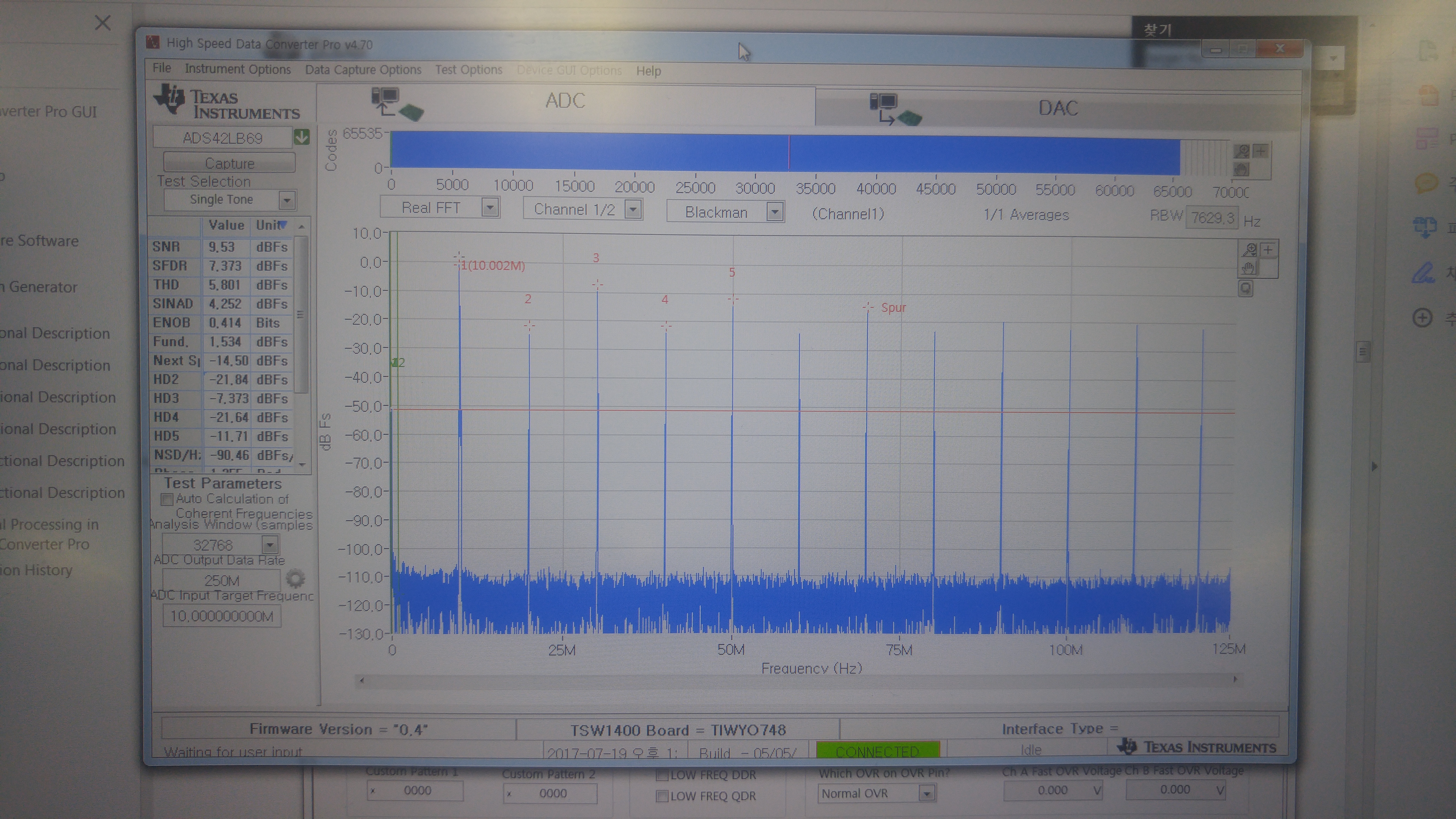 - Please kindly refer to my test result with settings for ’ADS42LBx9 GUI’ and ‘High Speed Data Converter Pro’ and let me know how to get the same result on ADS42LBx9EVM User's Guide. In my test, Clock Input was 250MHz and Signal input was 10MHz.