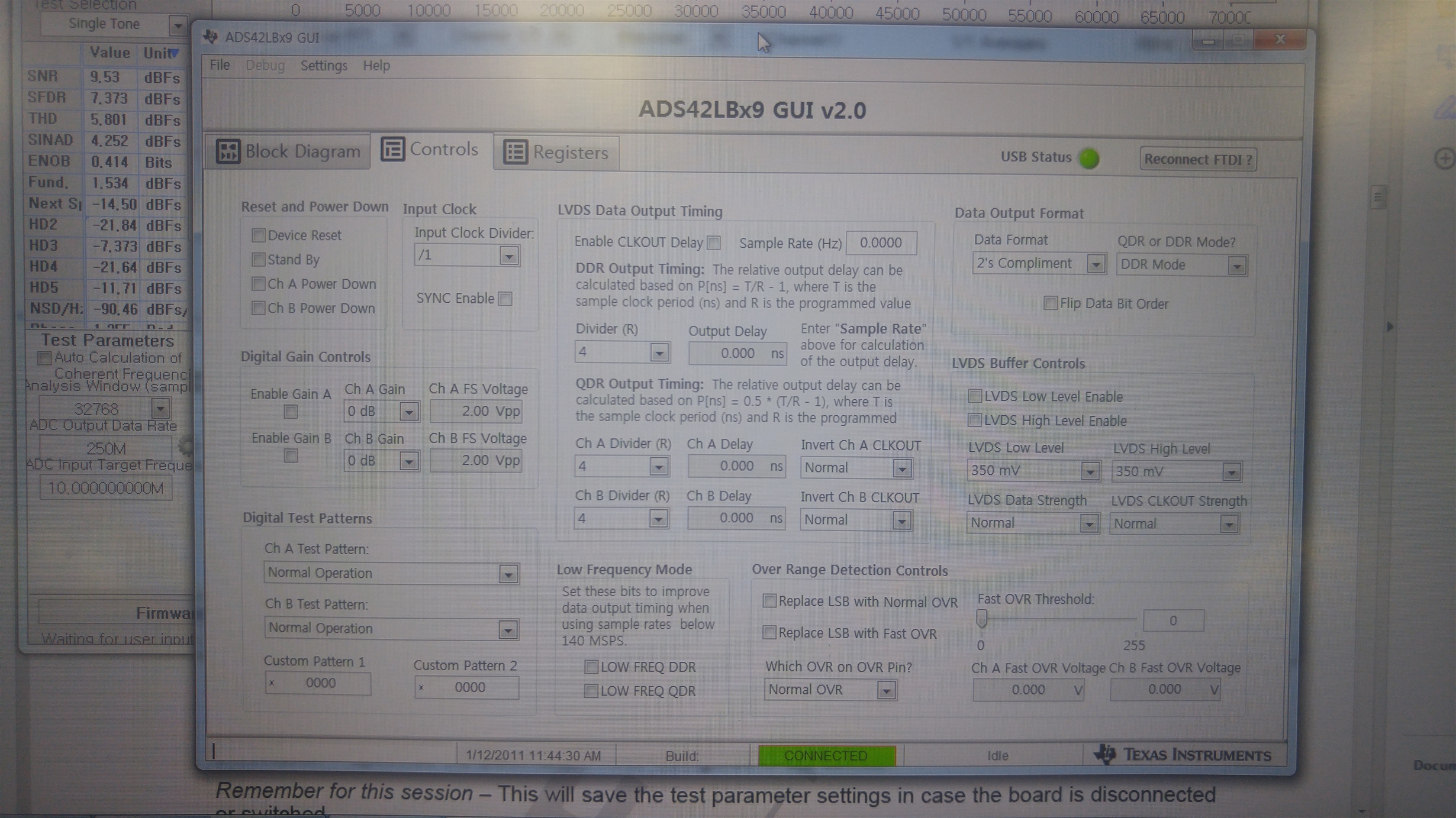 - Followed ADS42LBx9EVM User's Guide in http://www.ti.com/lit/ug/slau465a/slau465a.pdf