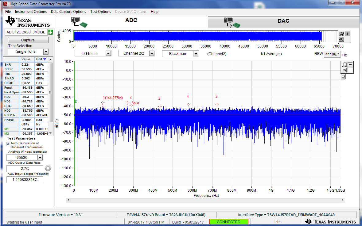 I am using the ADC12DJ3200EVM with the TSW14J57. I am following the instructions in the user guide SLAU701. I setup the ADC as detailed in 3.10.1 through 3.10.3. Then I go to step 3.11 and 3.12. I am supplying a filtered 1.91GHz signal at 0dBm to the VINA input (J2) of the ADC evaluation board. I see a raised noise floor. Can you please let me know what I may be doing wrong? Thanks. See images below: