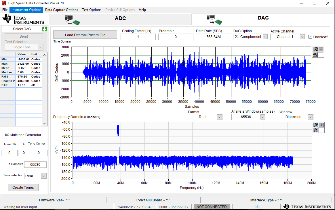 Hi I am using the tsw14j56EVM along with the tsw38j84EVM. I am trying to use my own data within csv files and send them to the pattern generator. I have a matlab script which populates the csv file, I also loaded this file onto the High Speed Data Converter Pro GUI. My question is does the Data rate setting on the GUI need to match with the frequency of the signal? It seems to like this way with the test files which are provided with the software. I followed the test setup procedure described in the tsw38j84 manual but it seems to not be sent correctly. NOTE: I followed used a provided test file with and got the expected result. The only issue I can see with my data is the data rate. I am not sure How I can get it to match with what is required? I will include the code I have along with pictures from the GUI, Thanks for any help.