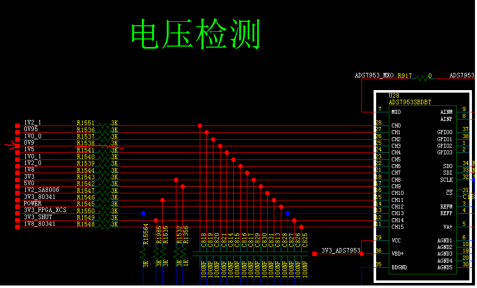 My customer uses ADS7953 to monitor the power supply. Their schematic is as below, you can find they monitor many power supplies. When they delete resistor R1538, and they use the scope to test the voltage is 0.59V, but they use SPI to read the voltage, it is 0.82V. I have double checked with Customer, they probe is OK.