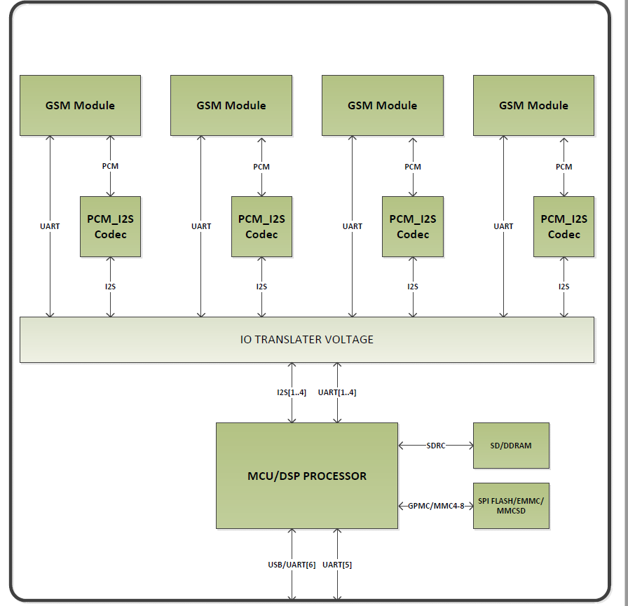 With requirement, all module GSM can work at same time when have a calling come in/out for tranfer voice data to this SOC/DSP/MCU ( processing and send back to mother board)