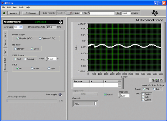 I'm using ADCPro that I downloaded from ti.com two days ago along with an MMB0 / ADS1258EVM. I also downloaded the ADS1258 plug in two days ago. So the code is up to date.