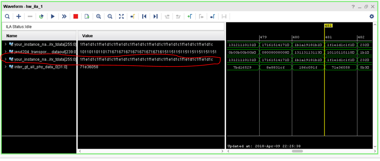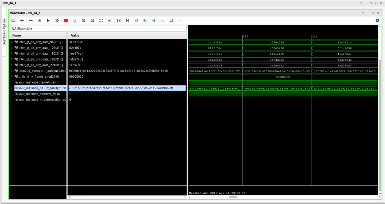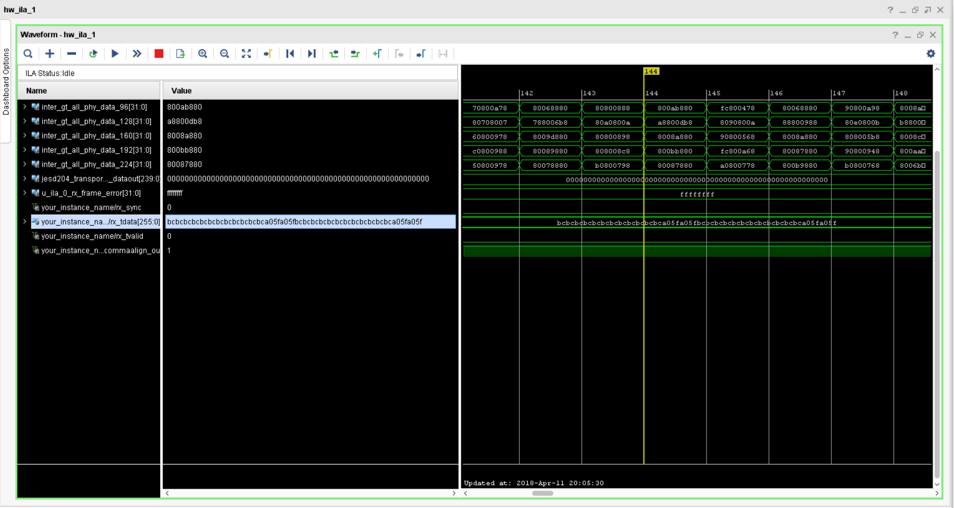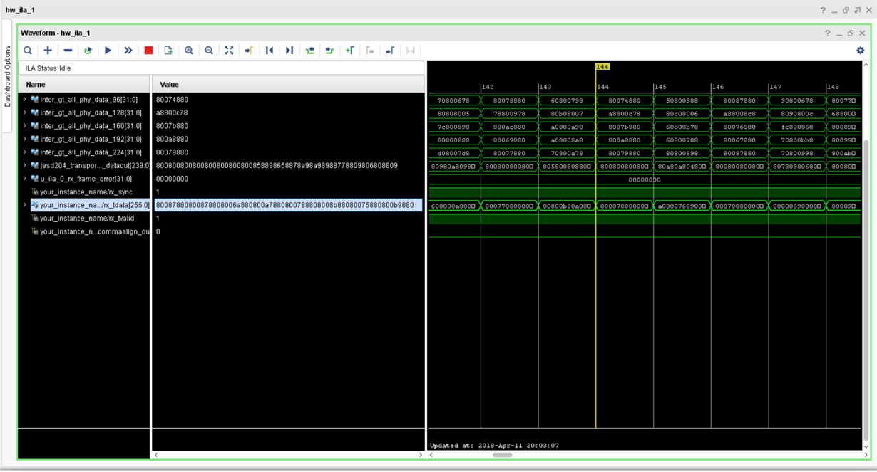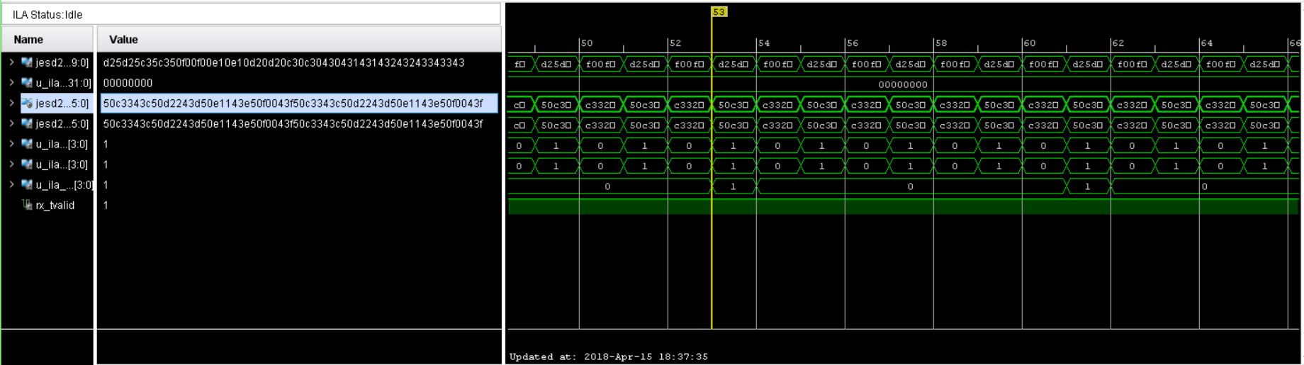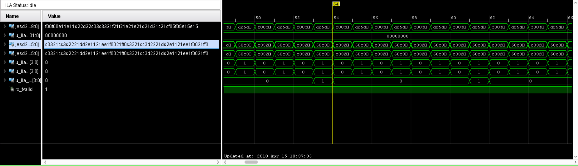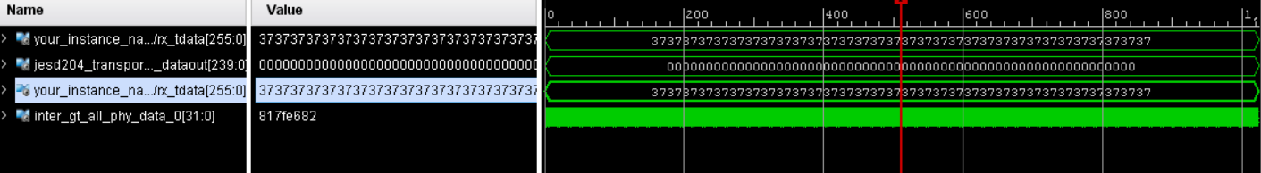 For ramp test mode I see, that data is OK. For normal mode I get wrong data (same samples are corrupted). I am using JESD204PHY and JESD204 IP (both are from Xilinx).