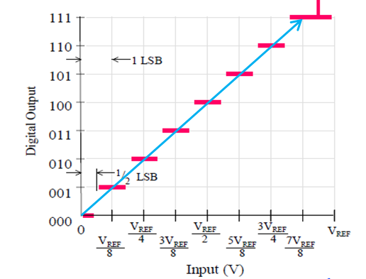 If we plot the transfer curve for the above ADC, the transition points will be as per table below.