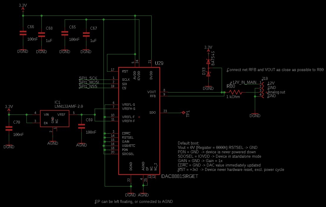 The circuit made is equivalent to: the Analog Output Closed-Loop Configuration shown in the datasheet on page 26. (on my board the RFB and Vout pins are connected at the point where the signal leaves the PCB)