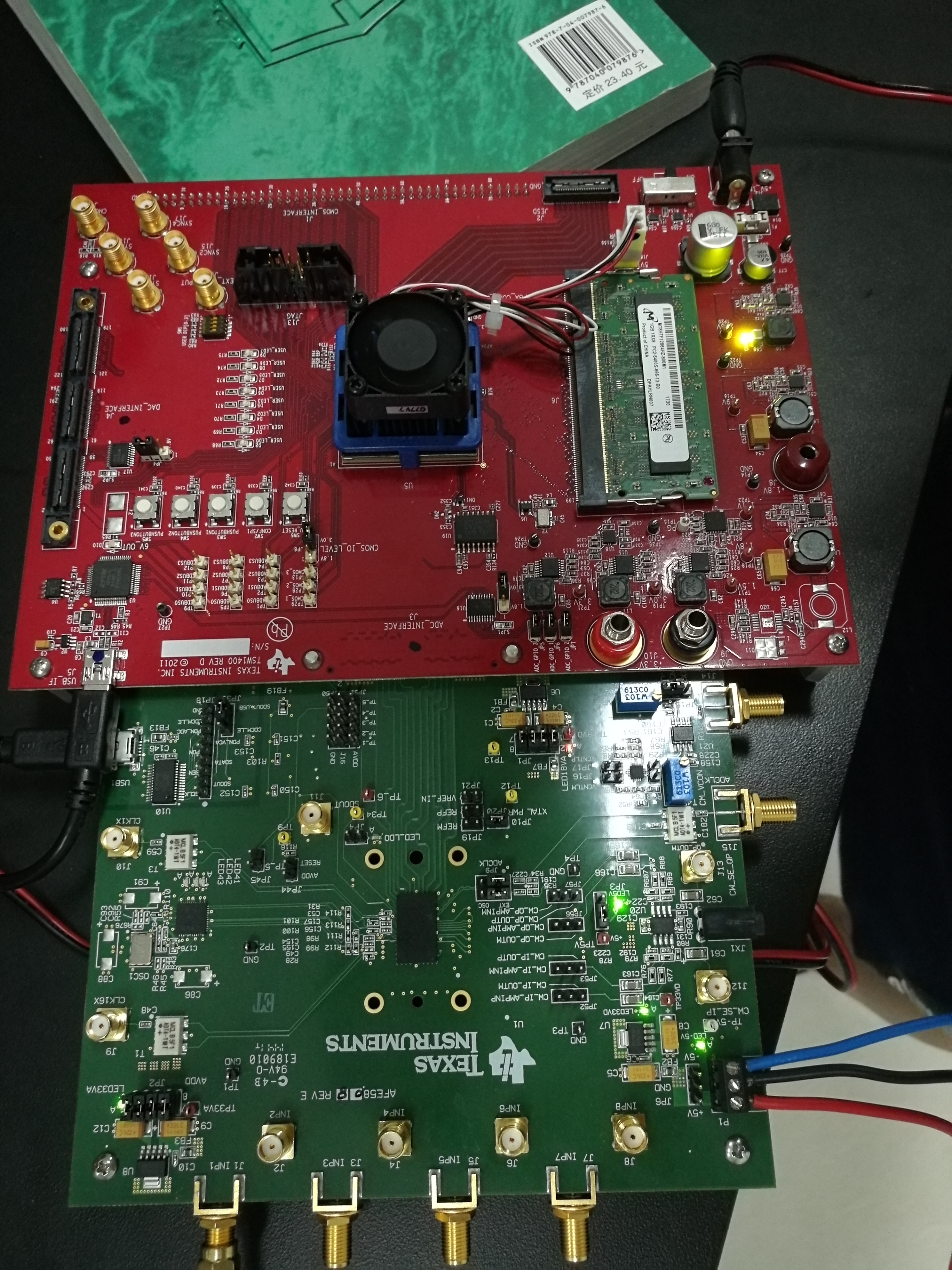 I'm currently using a TSW1400EVM to connect to AFE5808AEVM. After power up, the 5V input should draw around 0.37A. The only LED C87 is on. The power supply for AFE5808AEVM is providing +-5 volts and slightly over 0.7A.