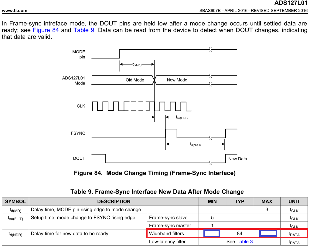 In frame-sync interface mode, "the delay time for new data to be ready" is mentioned on page 39 of ADS127L01 data sheet, so that td(NDR) is 84 x tDATA if using ADS127L01 with the wideband filters.