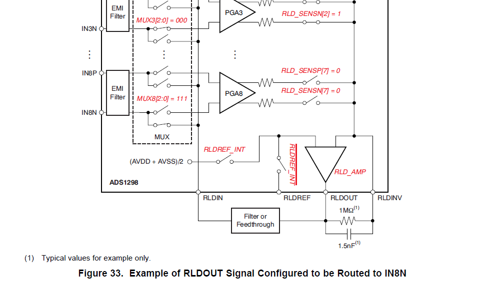 And I configure the RLD_SENSP=0xFE, RLD_SENSN=0x04, which means the RLD=CH2P+CH3P+CH3N+CH4P…+CH8P (the average of all the Electrodes).