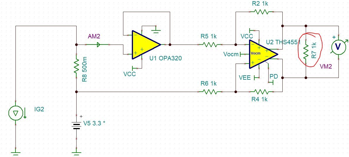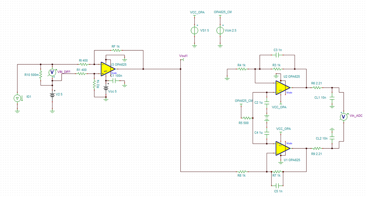 Since the reference voltage of ADC is starts from 2.5V, I need to map the resistor drop into full scale voltage, so I need gain amplifier. My input signal frequency may go upto MHz, so i need high bandwidth. so that i plan to use the same op-amp OPA625 For gain amplifier. I designed basing differential amplifier using this part and given the output to the front end of the ADC. the output is good but after few amperes say 50mA. This much initial amperes i cannot compromised. I need to avoid such limitations.