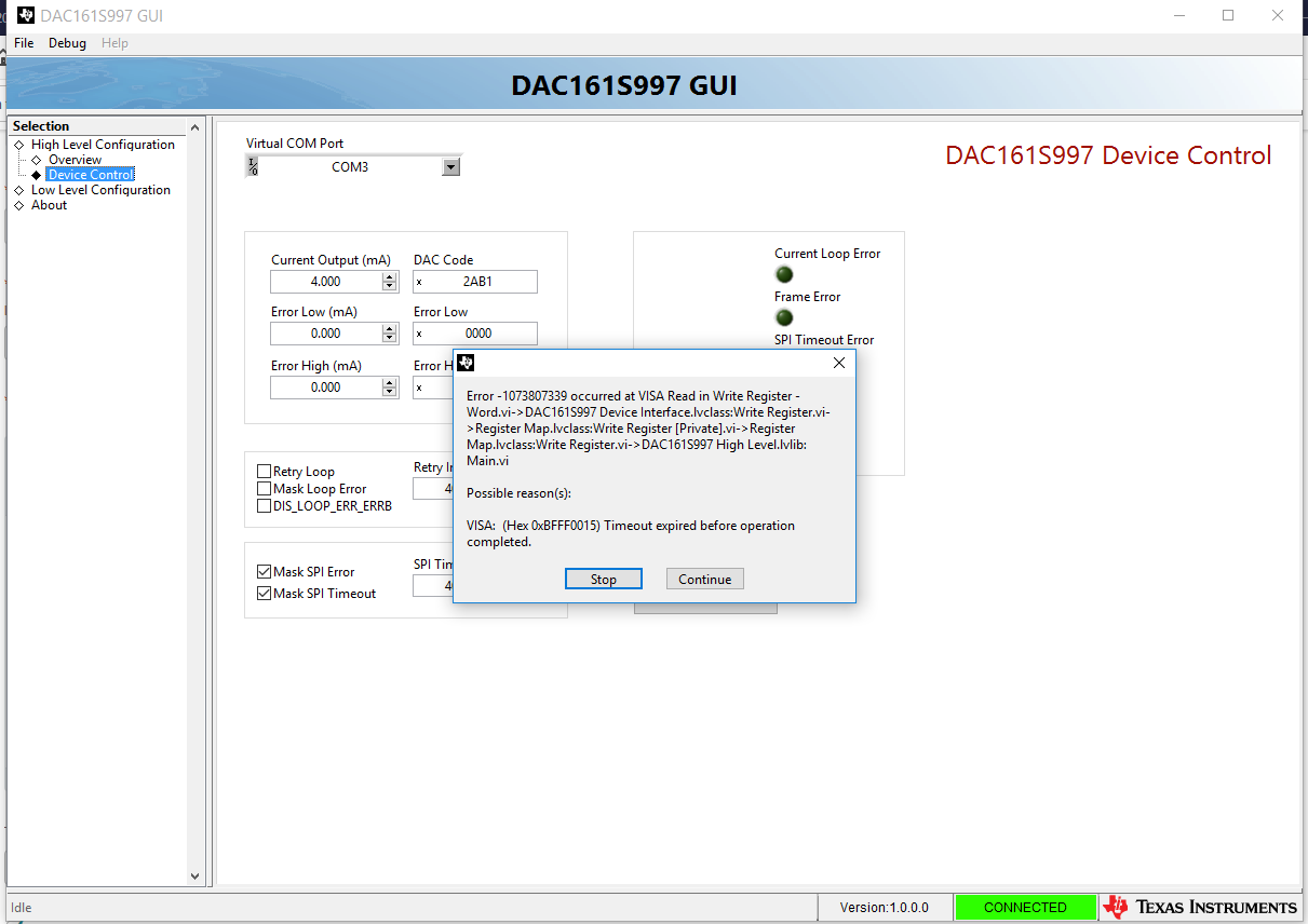 I'm trying to test the DAC161S997EVM through the accompanying LabView software. I'm trying to write a test value to the DAC board by selecting an output current in the DAC161S997 software, but an error continuously pops up with a timeout expired error (1073807339). Screenshots attached. I dont know if its a hardware or a software issue.