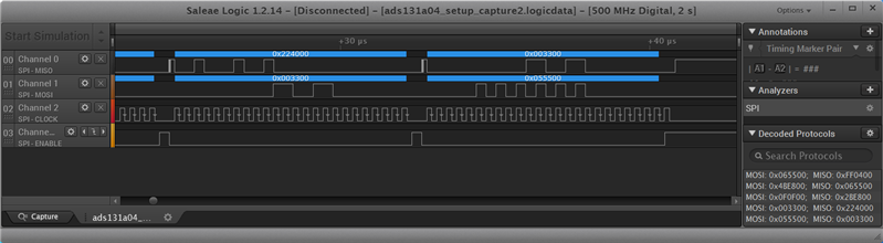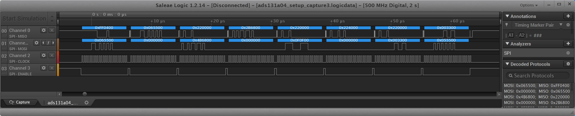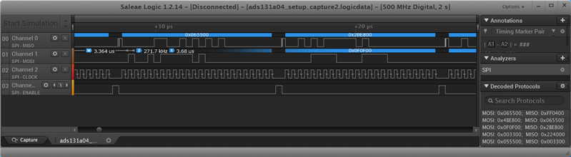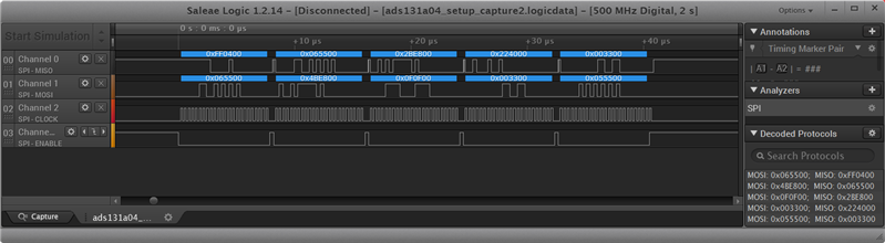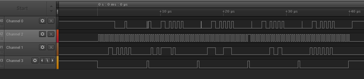 The clock period used was of 320ns and the channels visible in the capture below are as follows: