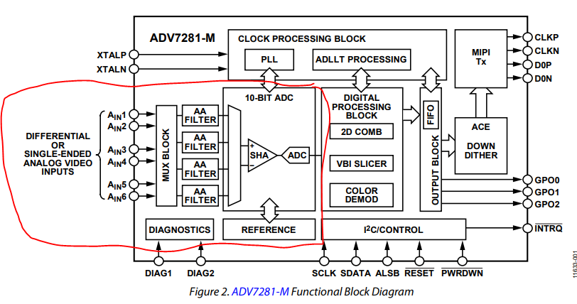 Thank you for the note. I am trying to take a differential analog video signal and convert it to LVDS to feed into one of our FPD-Link devices. The differential analog signal is about 1.5V max. Basically, I am trying to replicate what the ADV7281 can do on the front end of the device outlined in red: