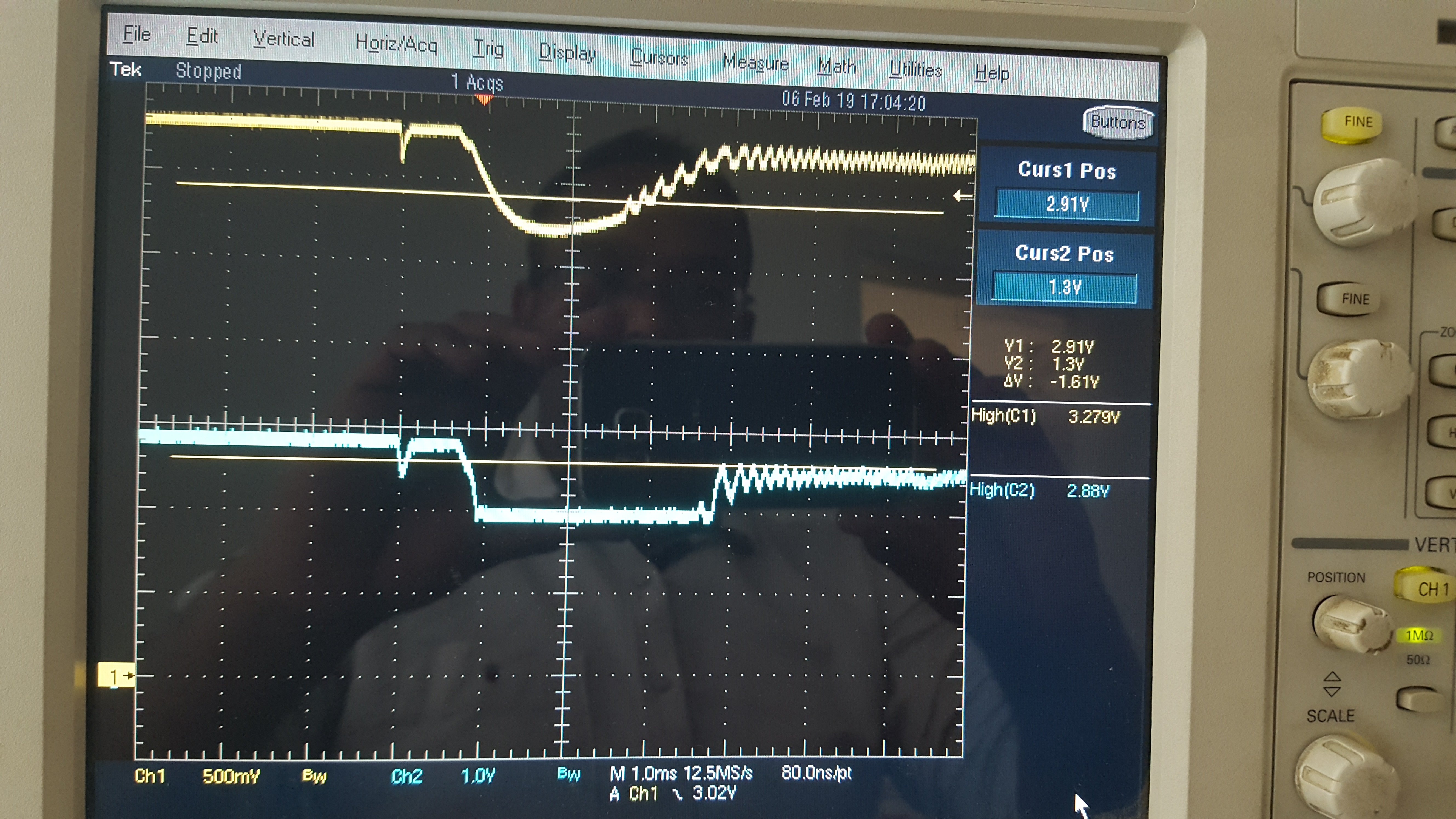 Observation 2: When the system supply is provided using TPS63020 (BUCK-Boost) with a battery input, we see that there is power drain (Voltage drops linearly 3.3V to 2.8V and rises linearly to 3.3V) for a period of 3ms on the 3.3V rail which is resetting the micro-controller (MSP432E4) when we are changing the channels of the ADC, it is quite random sometimes it is on the first channel change or second channel change.Which is not observed when 3.3V is provided from the Launchpad.