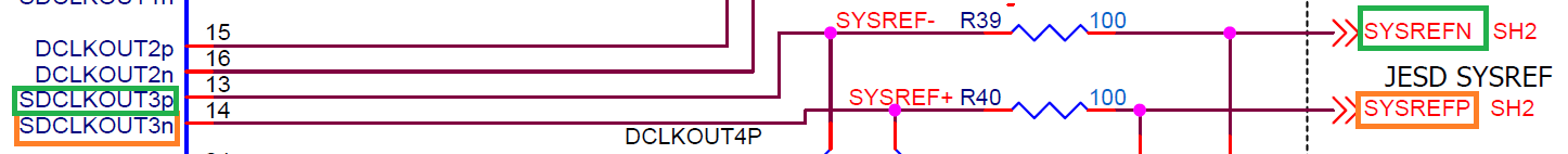 In the reference design for LMK04828 and DAC38RF8xEVM, sheet 5, the SYSREF (P, N) outputs are connected to the wrong pins on the device. SYSREFN is connected to SDCLKOUT3p and SYSREFP is connected to SDCLKOUT3n.