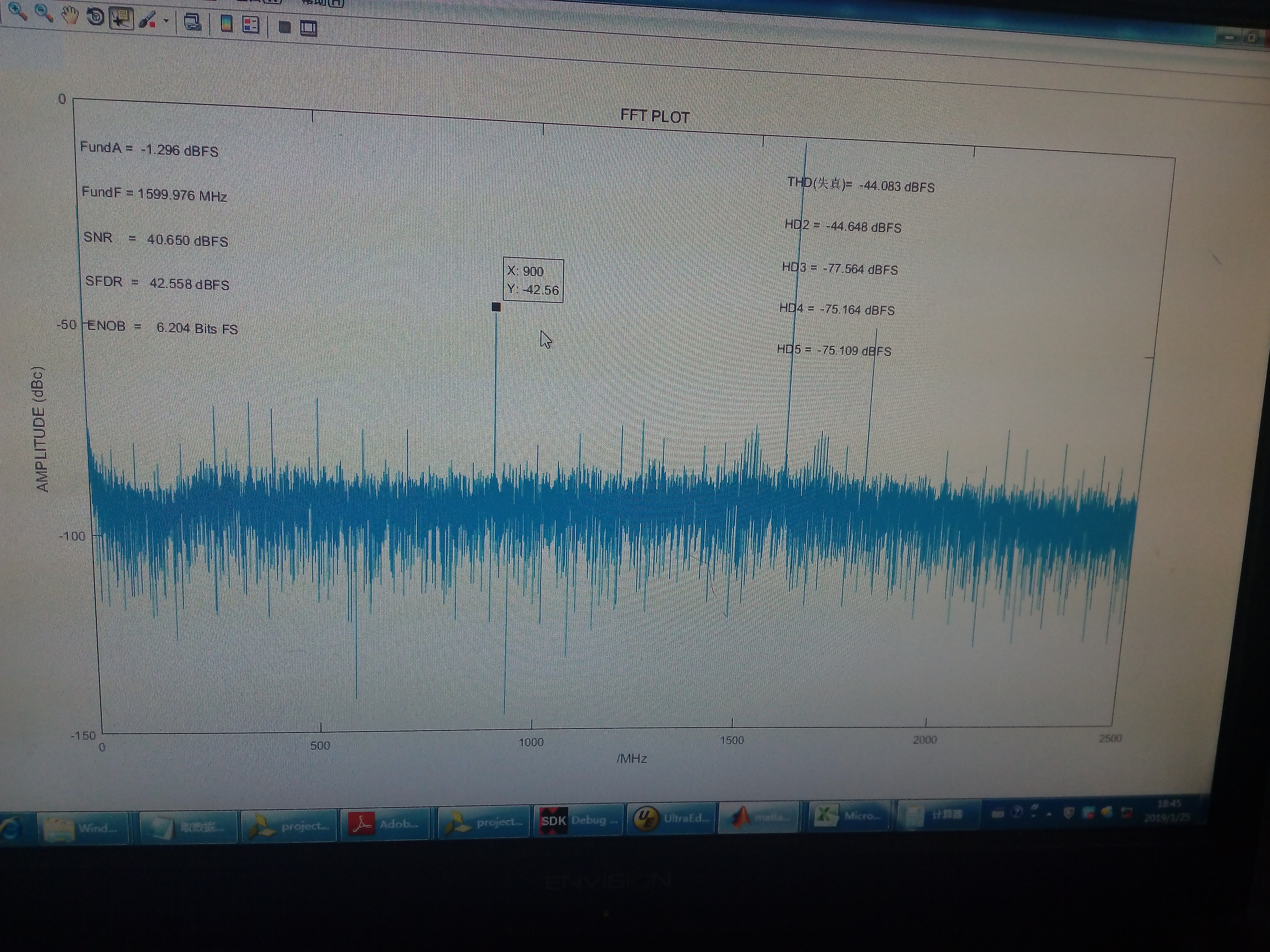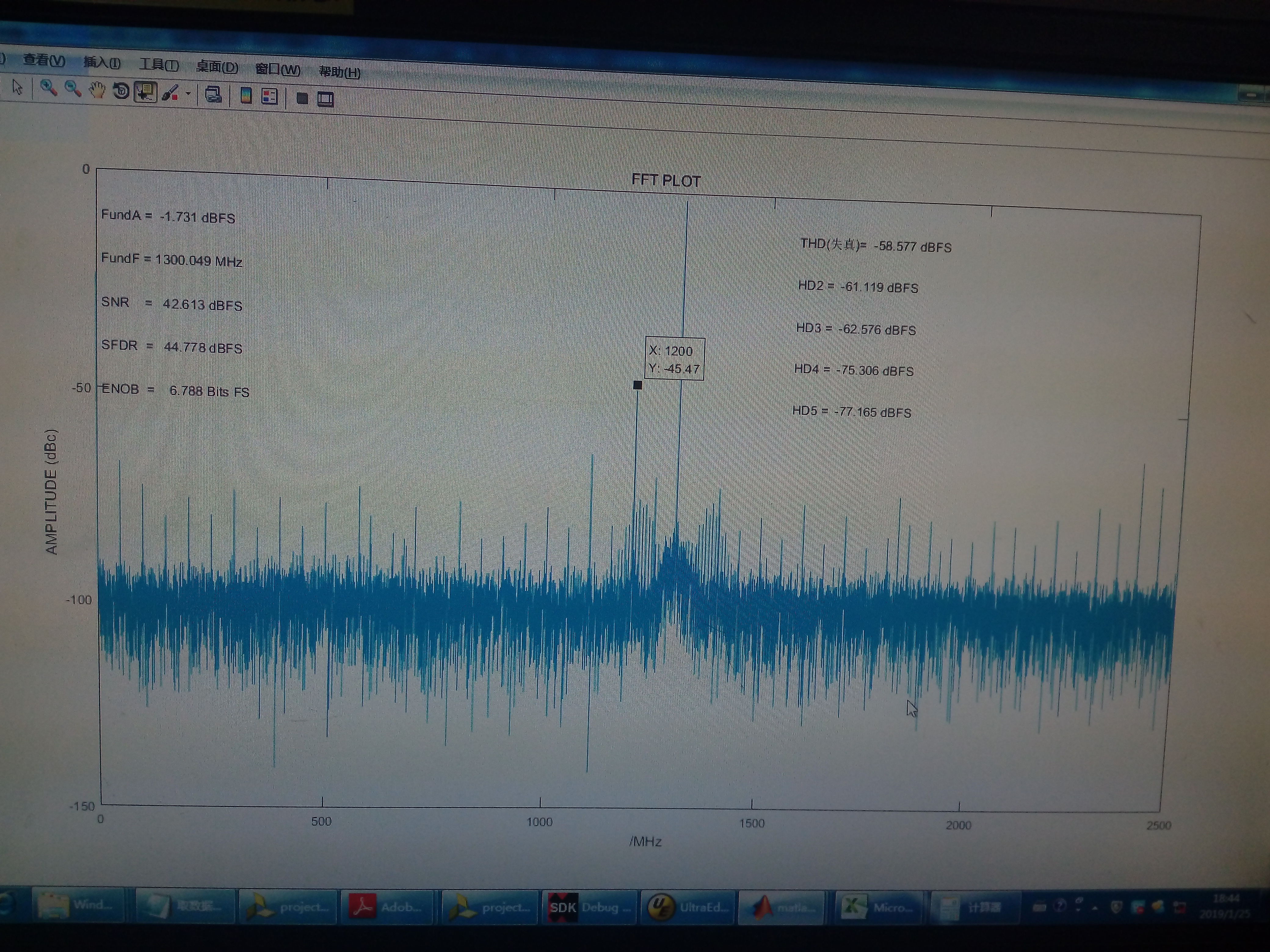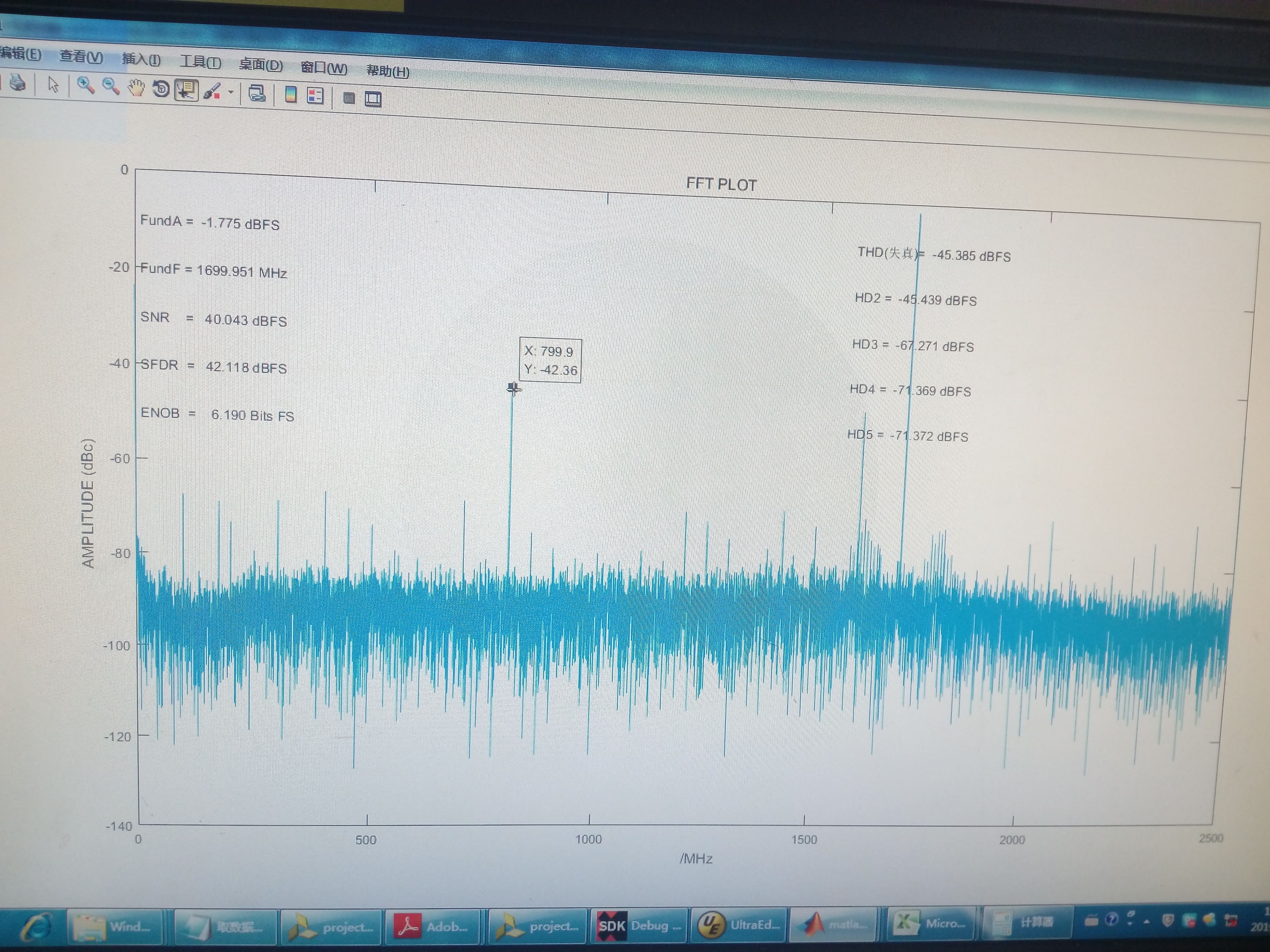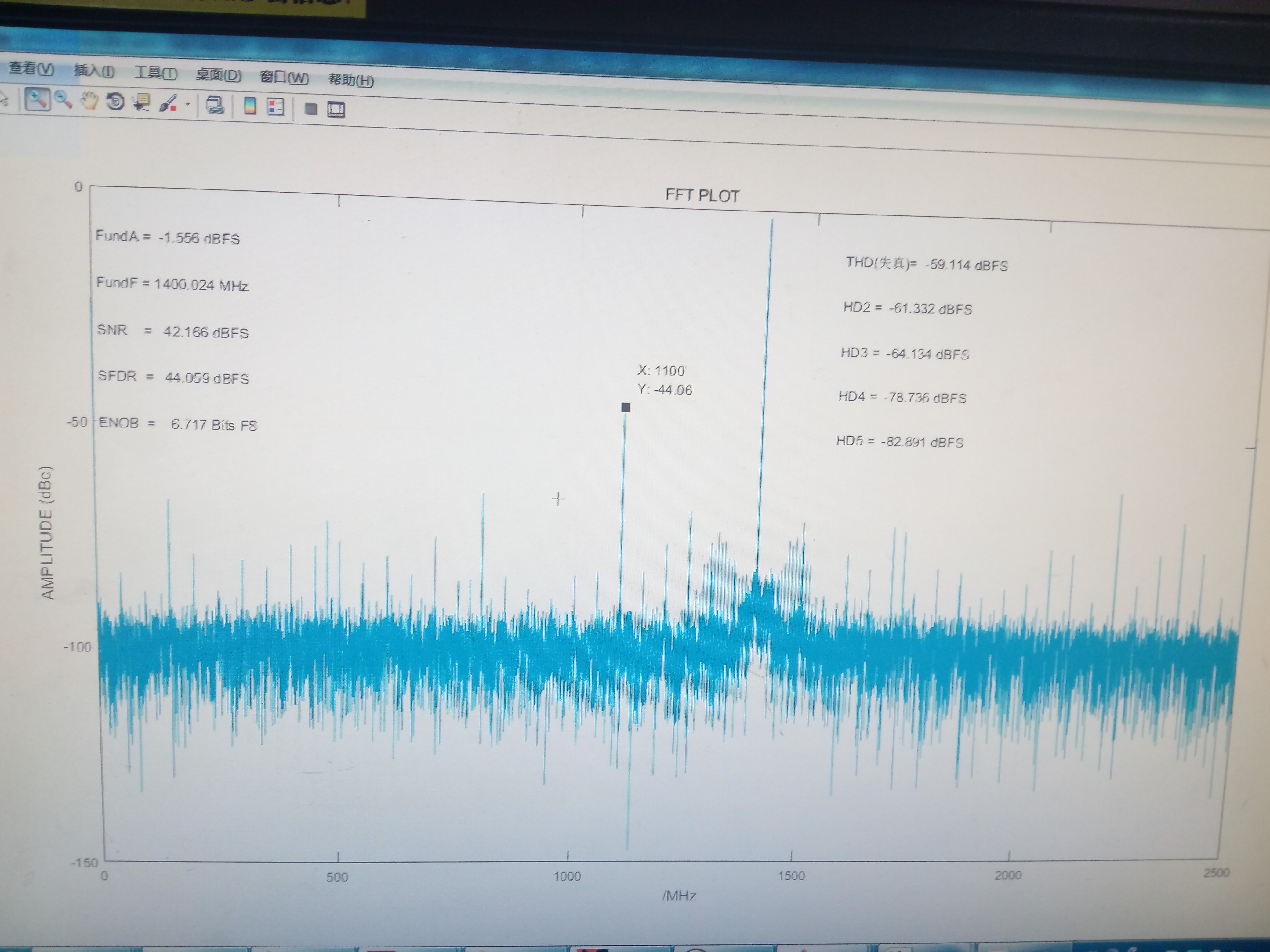 After the analog-to-digital convertion and spectrum analysing via matlab program, we found that the spur at Fs/2-Fin is too high in magnitude and worsened the SFDR performance(perhaps also worsened the SNR performance).
