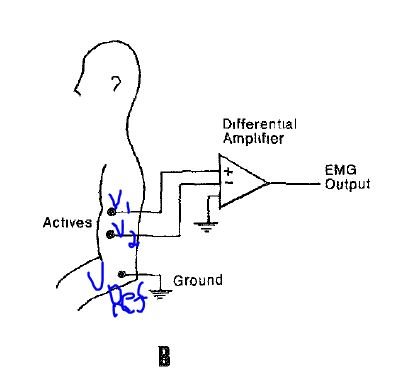I am connecting EMG's Mid and End muscle to the OpAmp's inputs (1 channel) and the 3rd reference pin to ADSS pin as an analog reference to the circuit.