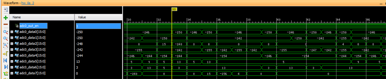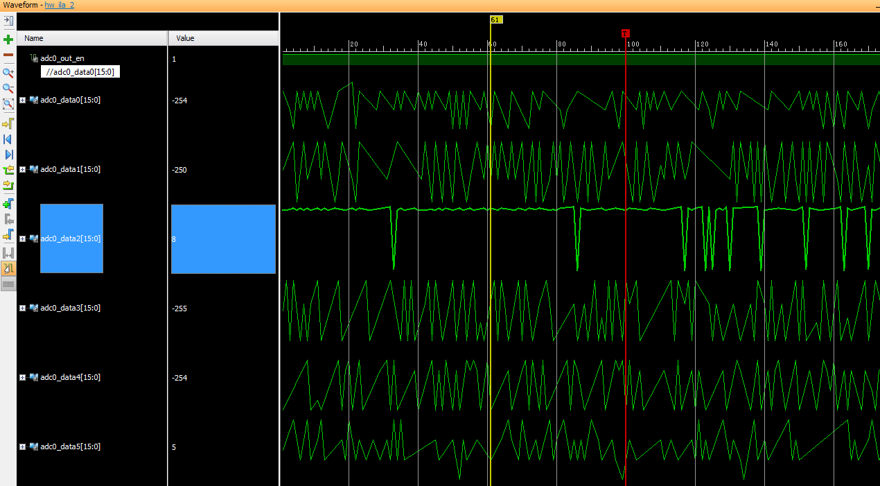 After I configure in this sequence, I can get right test pattern output 0xff00 in FPGA. Then I CHANGE the register 2 to 0x020000 to No pattern, and then I configure the AFE5801 as the same sequence above, but the output of AFE5801 I got in FPGA are not like noise. The digital data in 8 channels have 3 different type, one swing at -250, one swing at 10, and another one swing from -255 to 0. I think i should get noise swing near 0, and every channel are the same type.