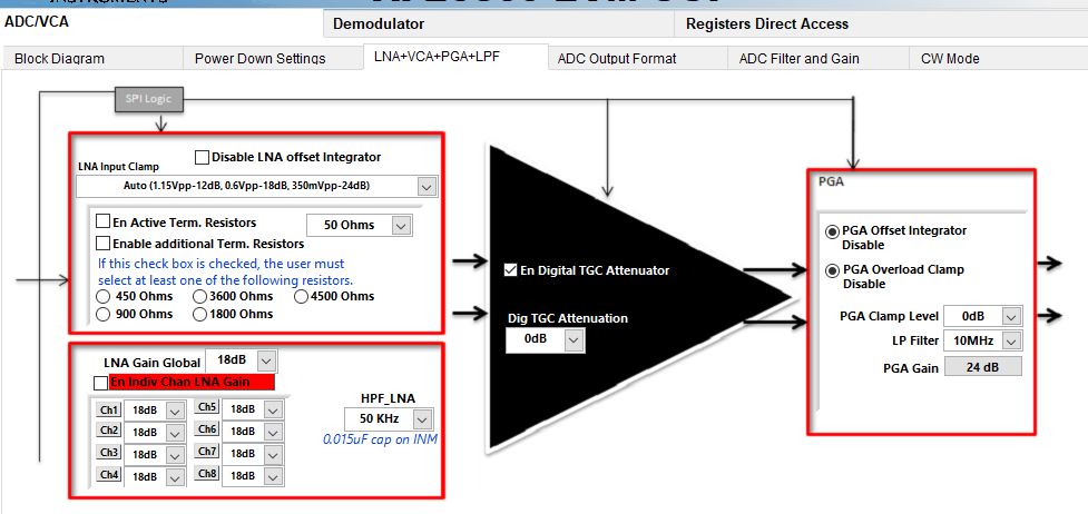 First image, check En digital TGC Attenuator, PGA offset integrator disabe, PGA overload clam disable, HPF_LNA 50 KHz, LNA gain global 18 dB