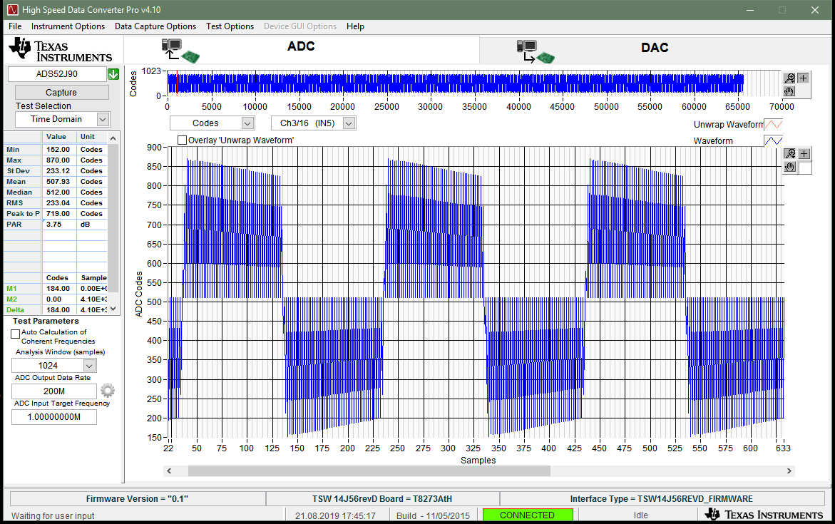 Yesterday Praveen Aroul provided me with configuration files for 8 channel between ADS52J90EVM and TSW14J56EVM on JESD interface: https://e2e.ti.com/support/data-converters/f/73/t/826737#pi320995=2. But I got this kind of results. Could you please try these configration files on your boards? Maybe cfg files are correct, but me is missing something?