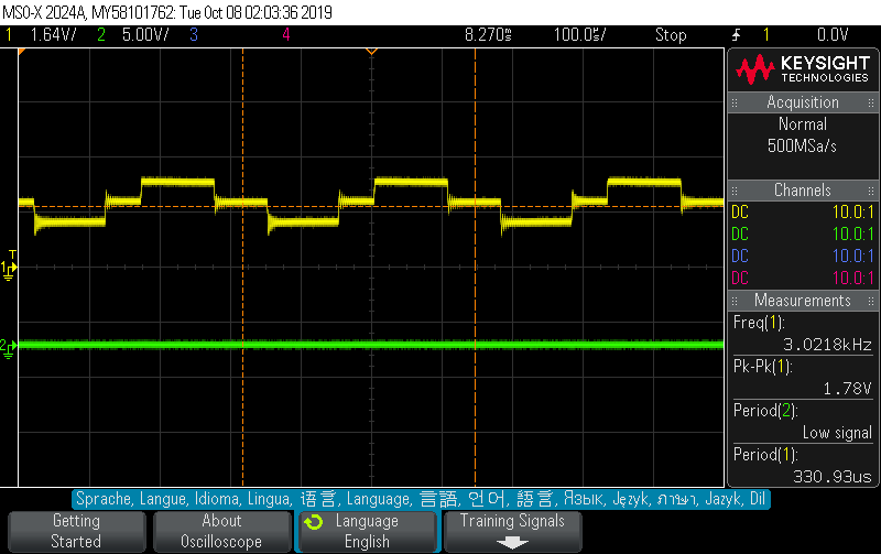 ADC SCK signal with yellow plot and ADC SDO signal with green plot.