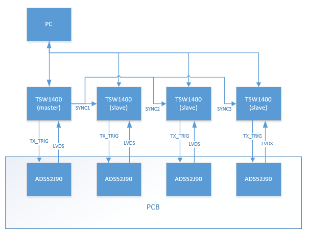 - From page 30 of the TSW1400 user manual SLWU079D, we can see that it appears to be possible to use up to five TSW1400 data capture boards to capture data in parallel using one board as the ‘master’ and connecting each of the SYNC1, SYNC2, SYNC3 and SYNC4 outputs from the master board to the EXT_TRG_INPUT of a ‘slave’ board. Can you confirm that it would be possible to capture 1000 samples from four ADS52J90 ADCs (i.e. one master and three slaves) at the same time using this setup?