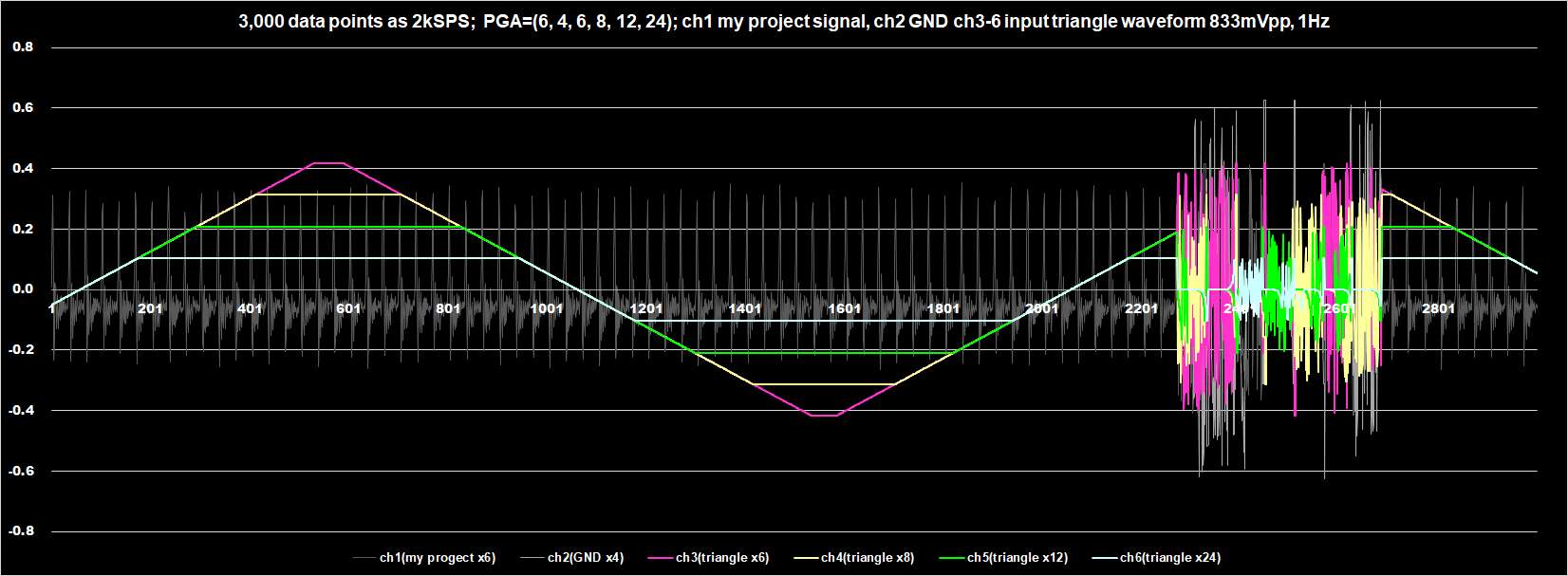 I tried to work data conversion of ADS1299-6 using RDATAC command. But my data conversion is wrong sometimes (2300 - 2700 th data points) as the attached graph. This graph is converted the HEX value of ADS1299-6 to DEC value.