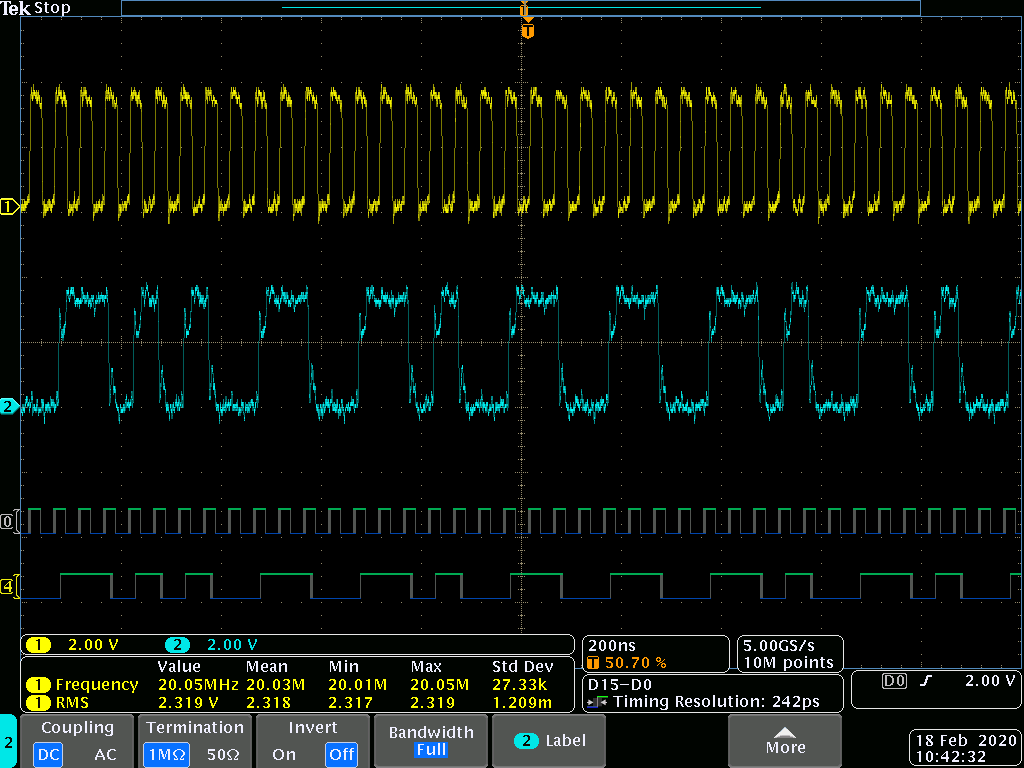 In the digital part the integrated is powered with a regulated 3.3V and an fpga generates the clock (20MHz) and rereads from dout through a sinc3 filter. DCLK is provided via clock driver with 100 ohms series resistor and DOUT has 33 ohms series resistor.